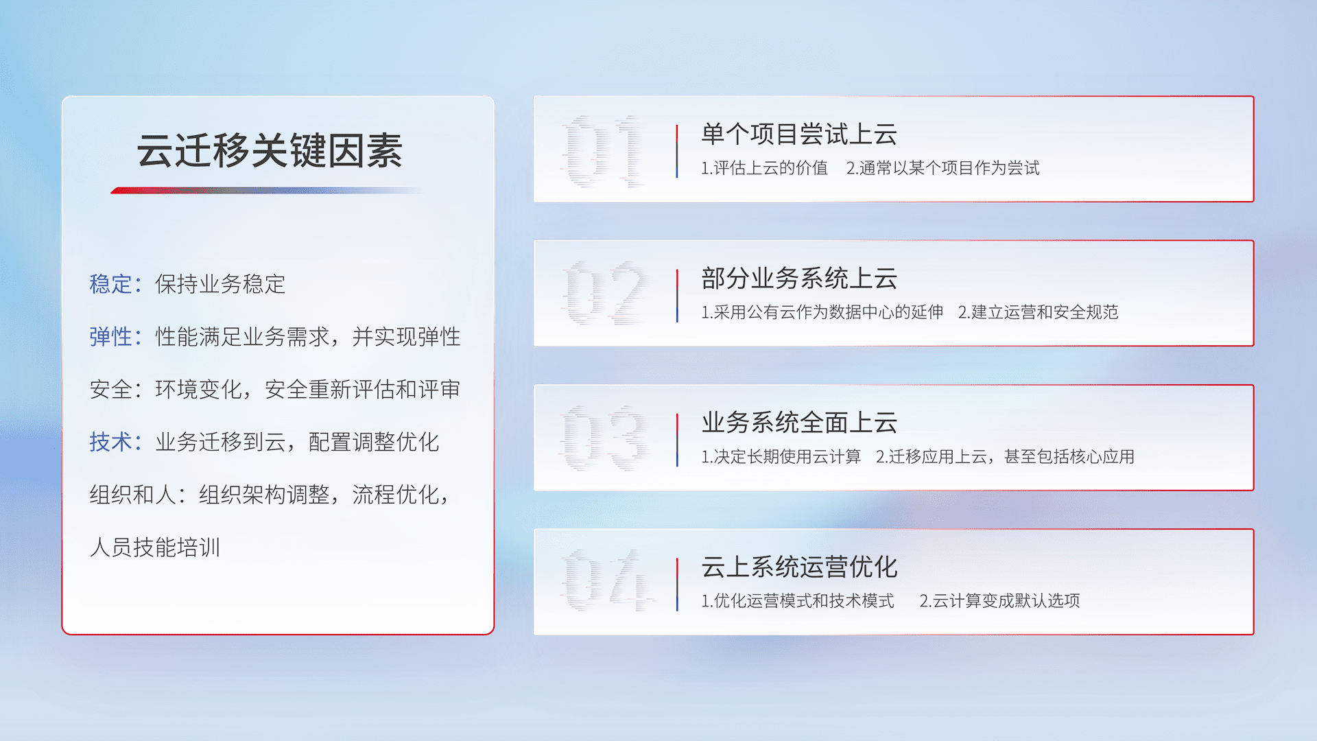 结合实际业务,,,,从规划设计、、云平台选型、、、、云原生改造、、、、数据迁移、、集成交付,,迁移全过程为客户识别最佳上云路径,,做好风险识别管理,,设计网络架构、、身份权限、、安全审计合规、、操作审计、、日志审计、、、监控告警策略、、、、多站点容灾设计等,,对云上基础设施进行整体规划,,,提升IT治理水平,,以满足弹性、、、高可用、、、、高性能的需求。。。